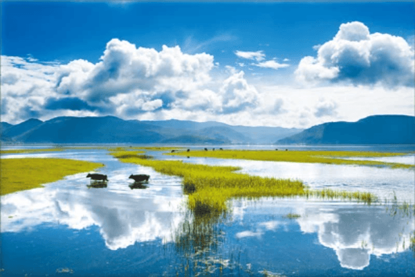 ナパ海自然保護区は省級自然保護区であり、2004年に国際重要湿地公園リストに登録しました。ナパ海とは「森林の裏側にある湖」を意味しています。季節性高山湖沼であり、雲南省でまれな亜熱帯沼沢地と沼沢草地です。依拉草原と一体となっています。夏のおわりから初秋にかけて雨量が最も多く、または青龍潭、納曲河、旺曲河の水が流れてきて、面積の最も