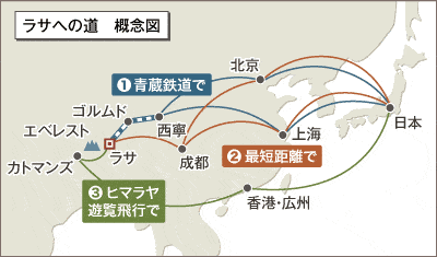 A. ラサへの経路は大きく分けて3つ。①西寧から青蔵鉄道で ②成都などの経由地から飛行機で ③カトマンズから飛行機で
