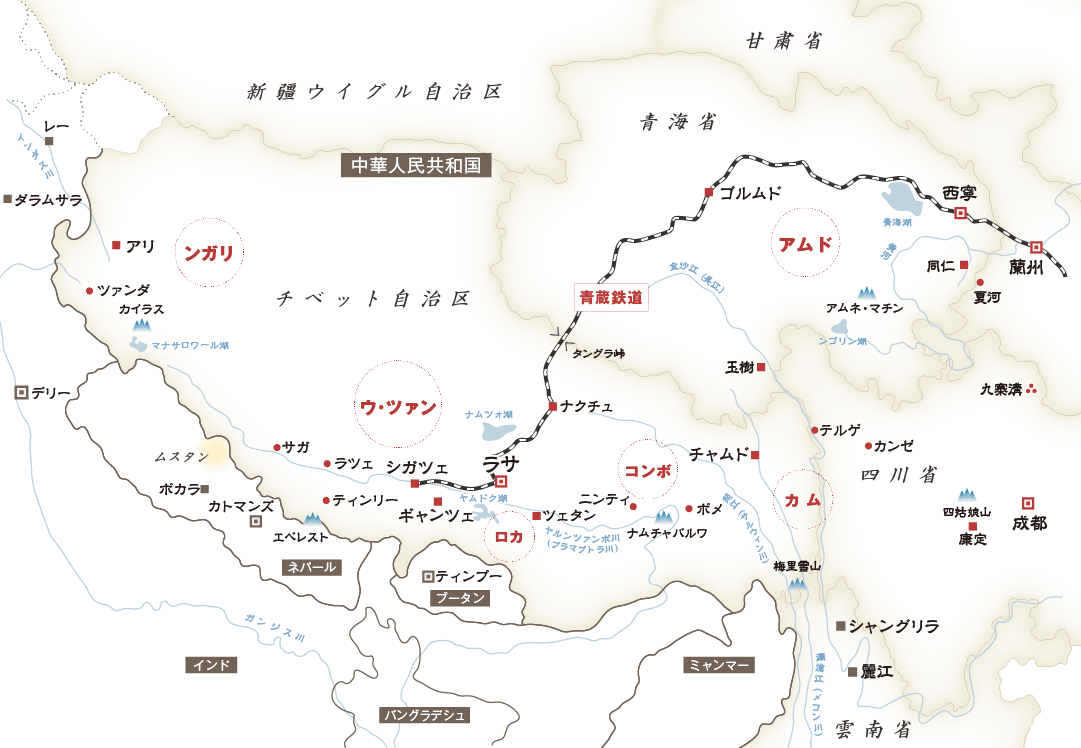 「世界の屋根」ヒマラヤ山脈の北側に広がる、日本の6倍もある広大なチベット高原。一般に「チベット」と言うと中国のチベット自治区を指しますが、チベット語を話し、チベット仏教を信奉し、ツァンパ(麦焦がし)とヤクの肉を食べ、バター茶を飲む人々(=チベット人)が暮らす地域は周囲の青海省、甘粛省、四川省、雲南省、更に国境を越えてブータン、ネパール、インドの北部にまで広がっています。