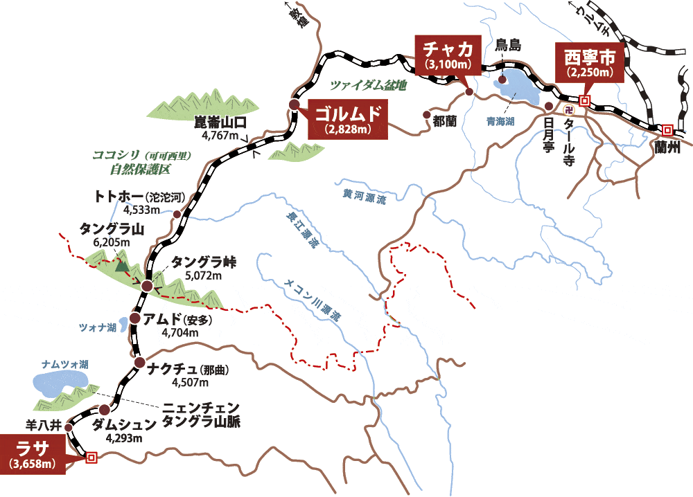 平均標高が4,000mを越える、世界でも最も高い地点を走る高原鉄道である青海チベット鉄道(青蔵鉄道)。青海省の省都・西寧とチベット(西蔵)自治区の区都・ラサ間の全長2,000kmを約21時間で結びます。酸素量が調整された快適な車中からは、何処までも続く大草原や白い雪を被る高峰、氷河をたたえた峠、家畜の群れや野生動物、碧く輝く湖などダイナミックな景観を満喫します。車内生活と高度順応をサポートします。