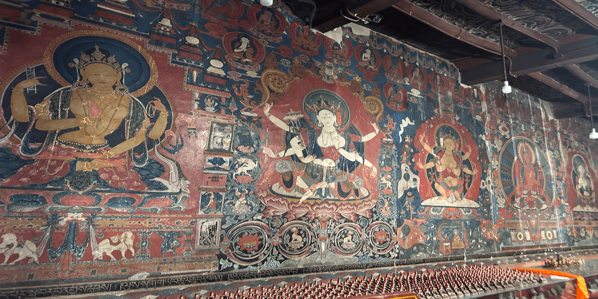 寺の壁には、ネパール様式をはじめとする様々な時代の影響を受けた美しい壁画が残されており、静かな境内でゆっくりと眺めていると、時を超えたチベットの芸術と信仰の世界に引き込まれるようです。
